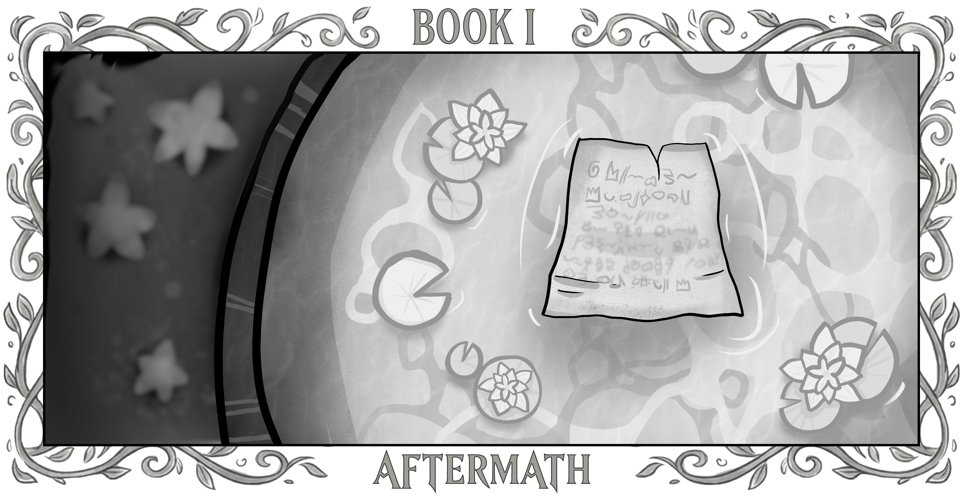 A handwritten warning from Goddess Tierra rises in the sacred fountain—hinting at danger in the Bioluminescent Forest. A quiet turning point.